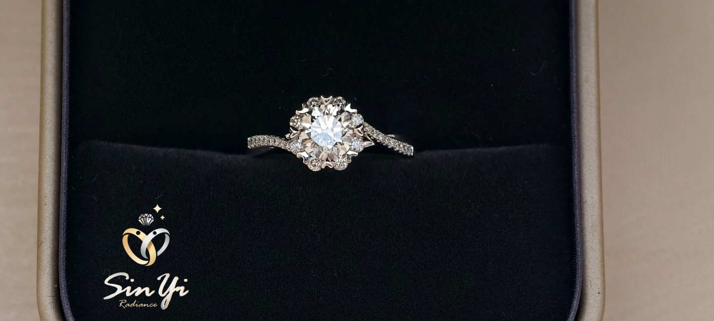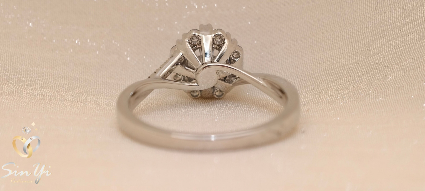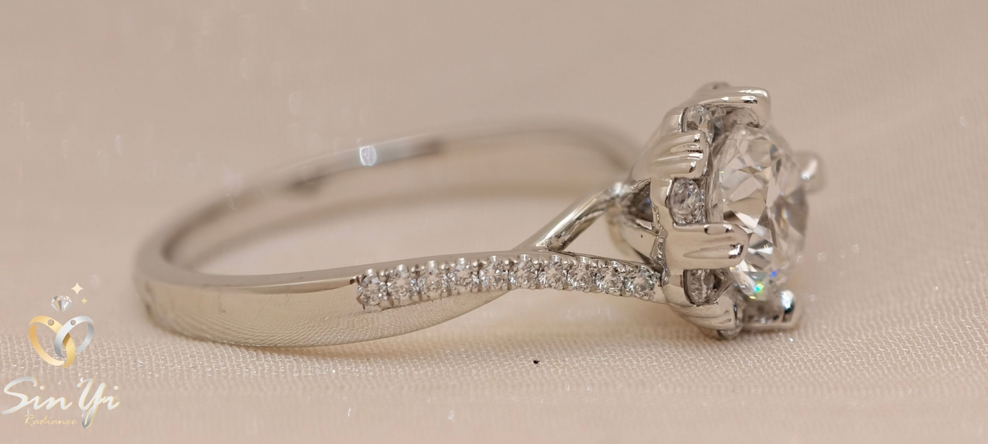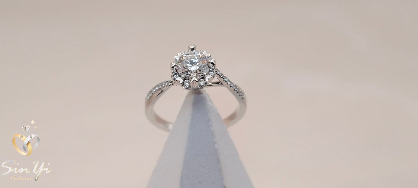 如花冠般環繞的光芒, 襯托中央圓鑽的純粹閃耀。 細緻群鑲設計,讓光線層層折射, 低調卻難以忽視的優雅存在。