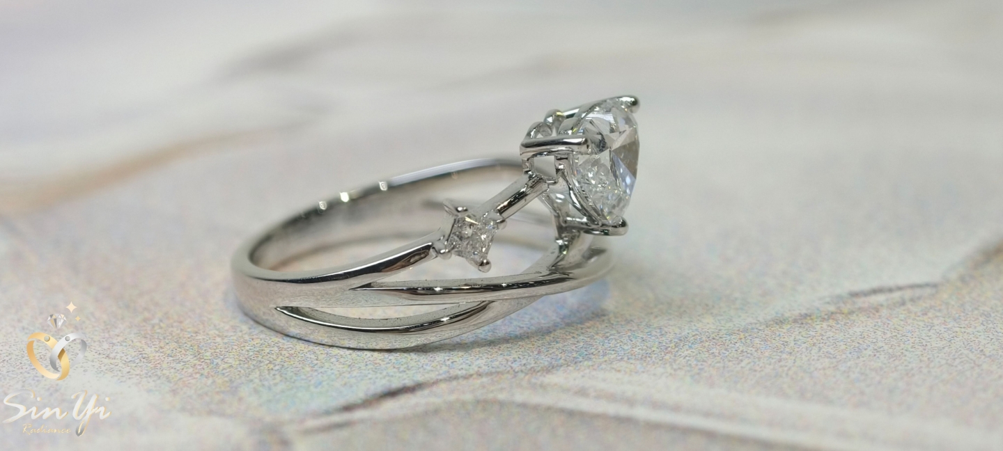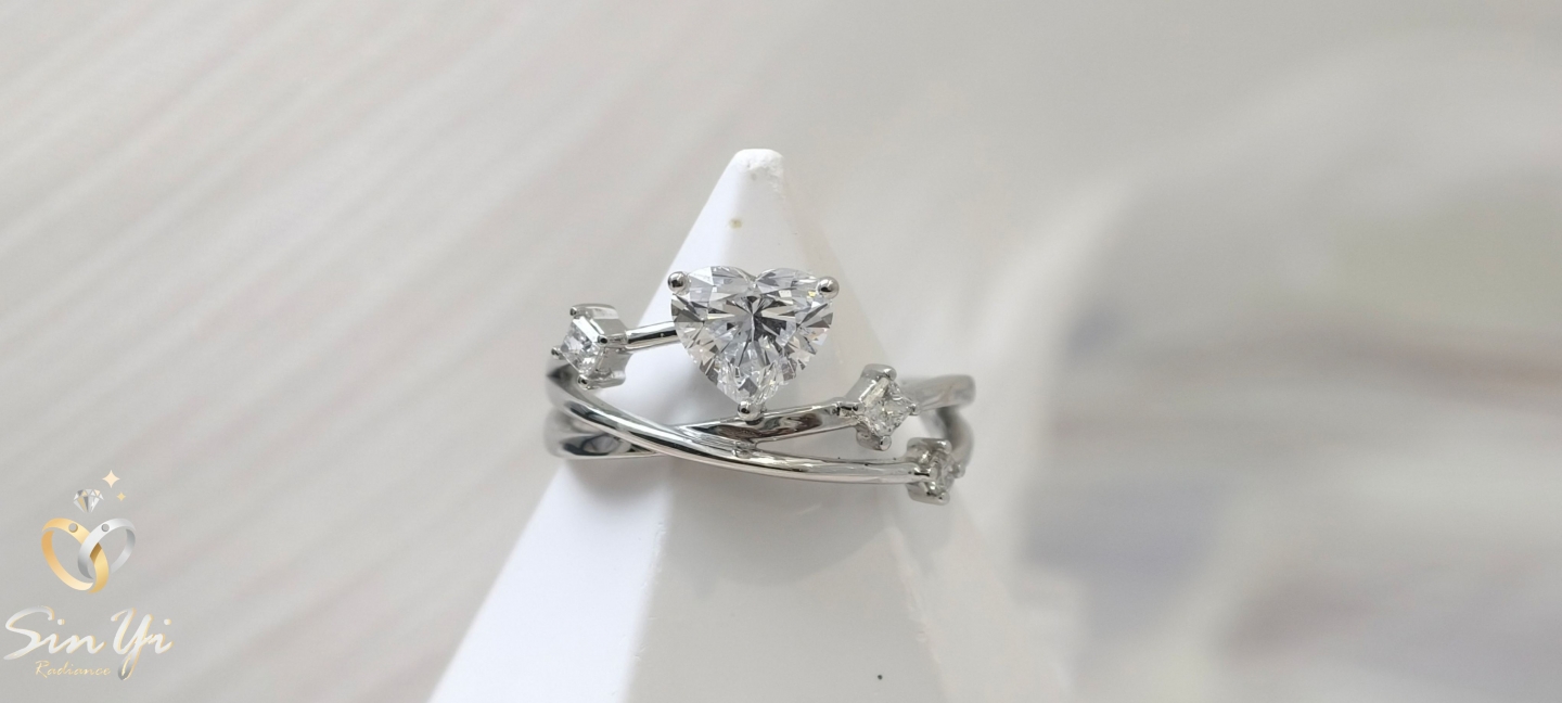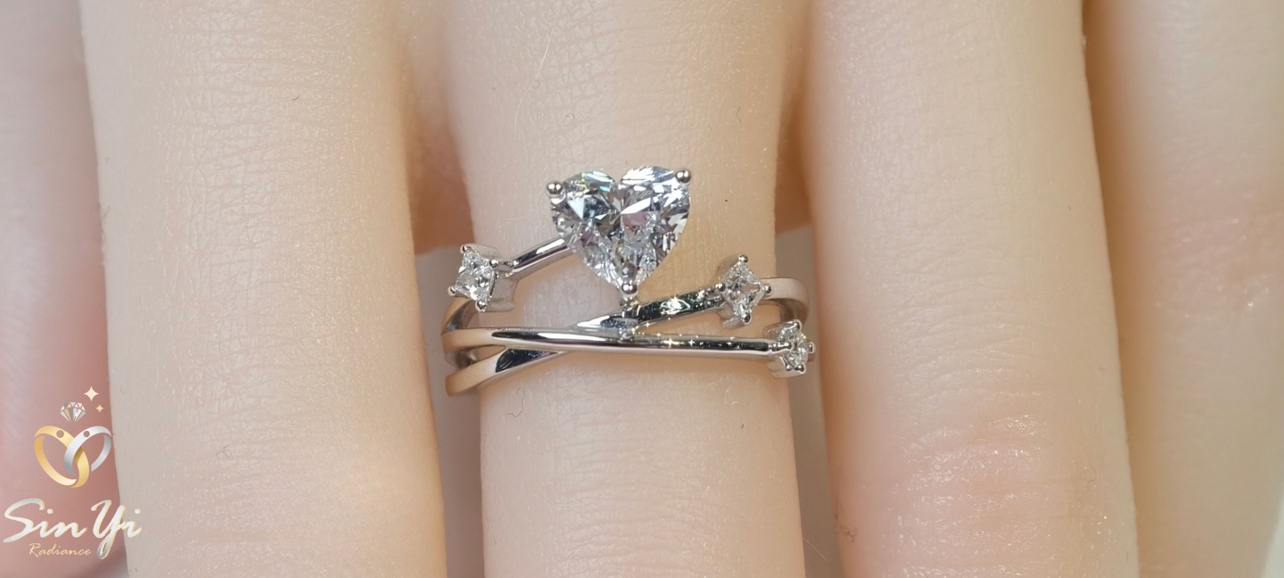 心形主石閃耀純粹光芒,搭配交錯流線戒圈,