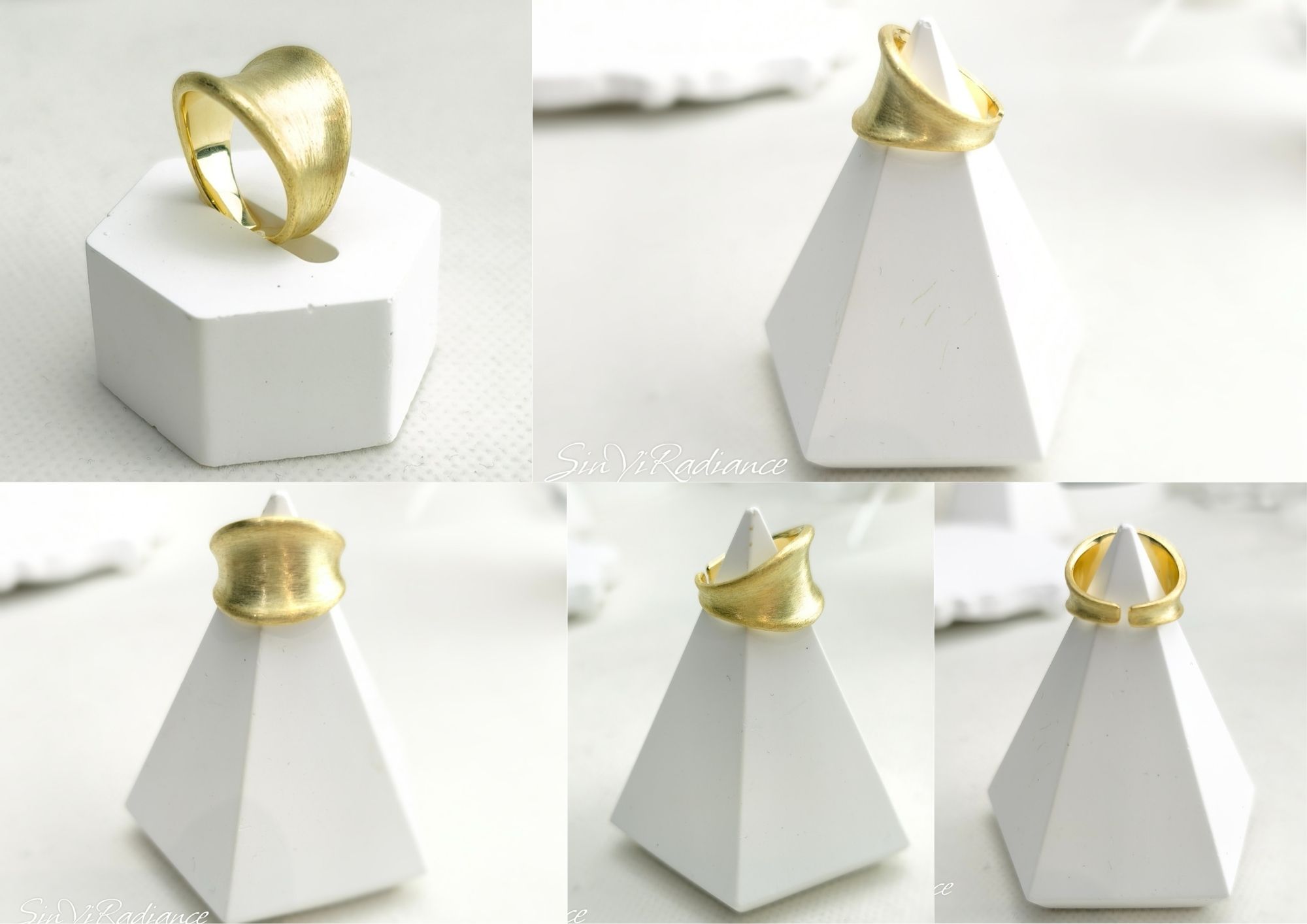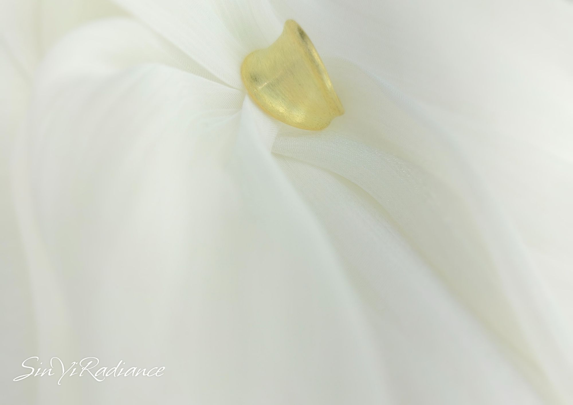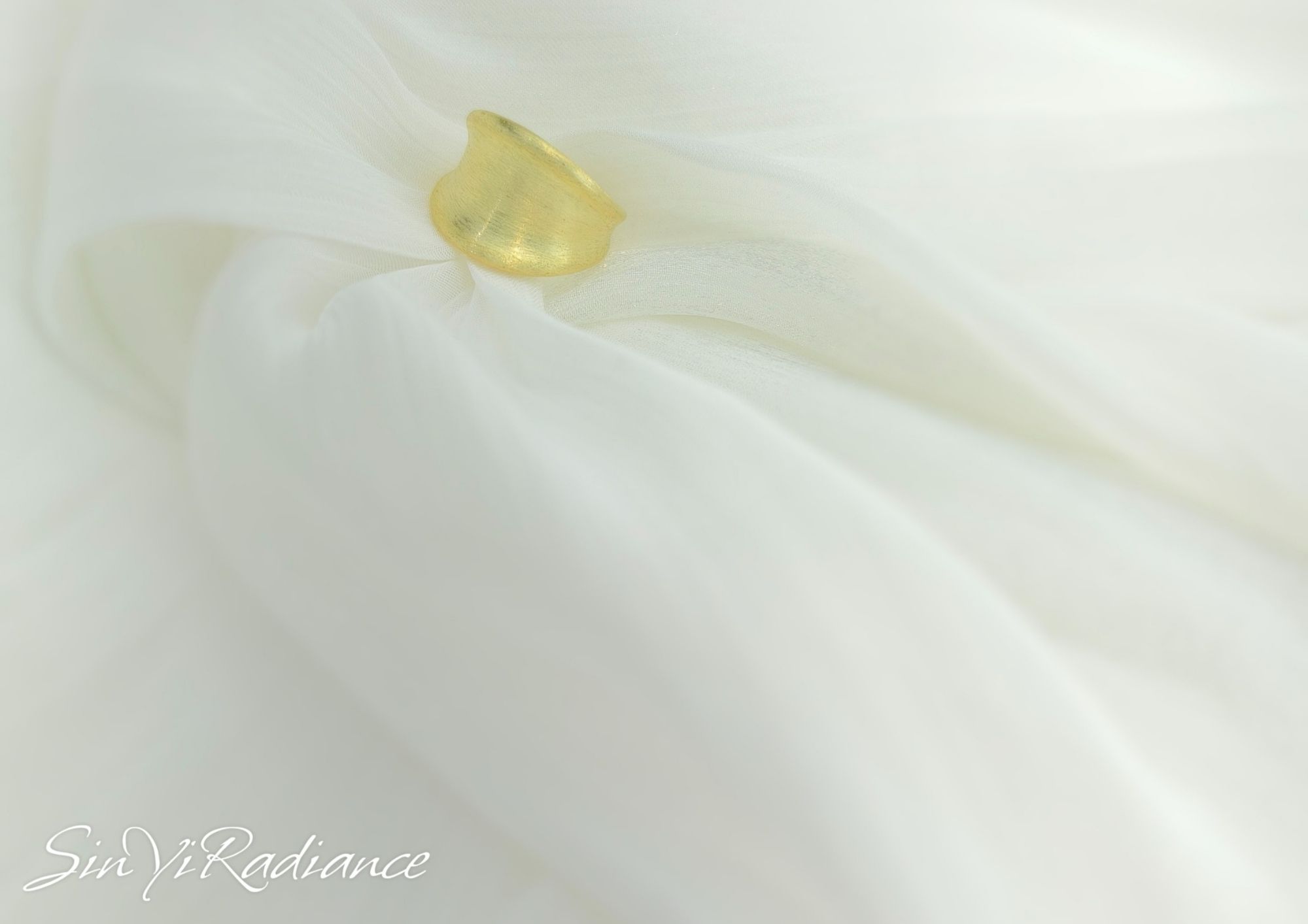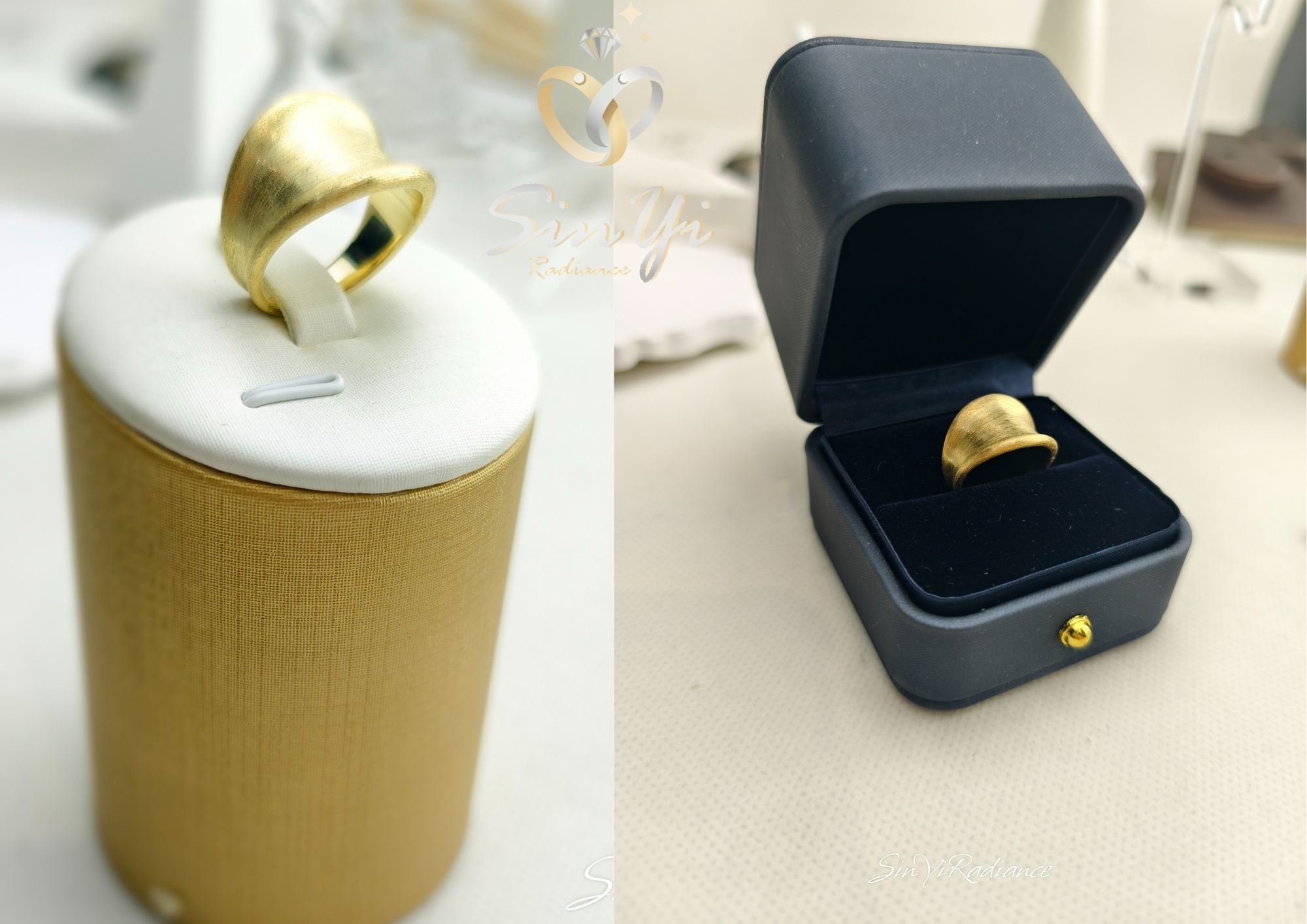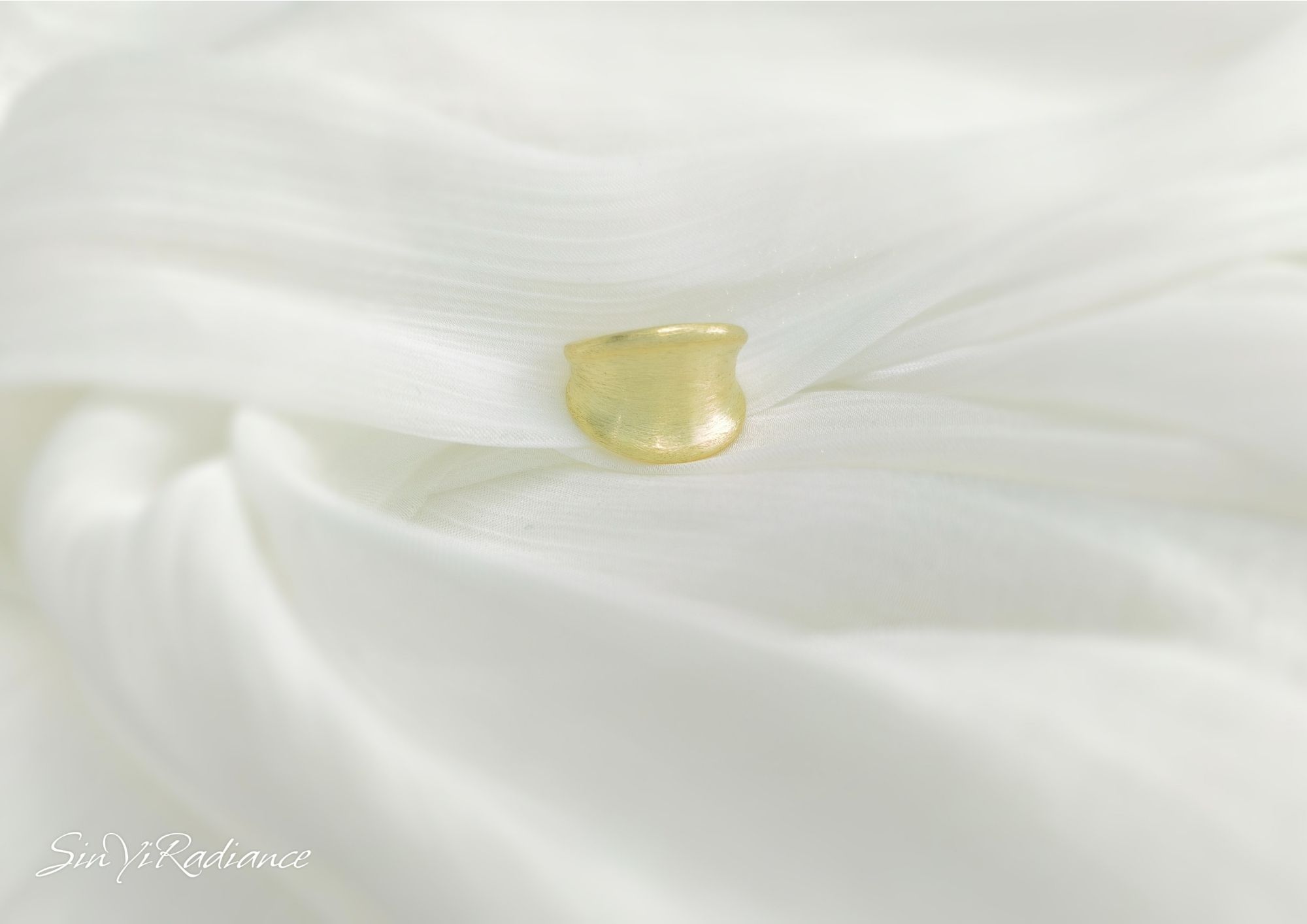 霧面金的細緻光澤,彷彿晨霧中隱約閃耀的陽光。 設計師以流暢的弧形曲線勾勒戒環,結合柔霧金層次, 讓每一次舉手投足都散發沉穩的高級氣場。