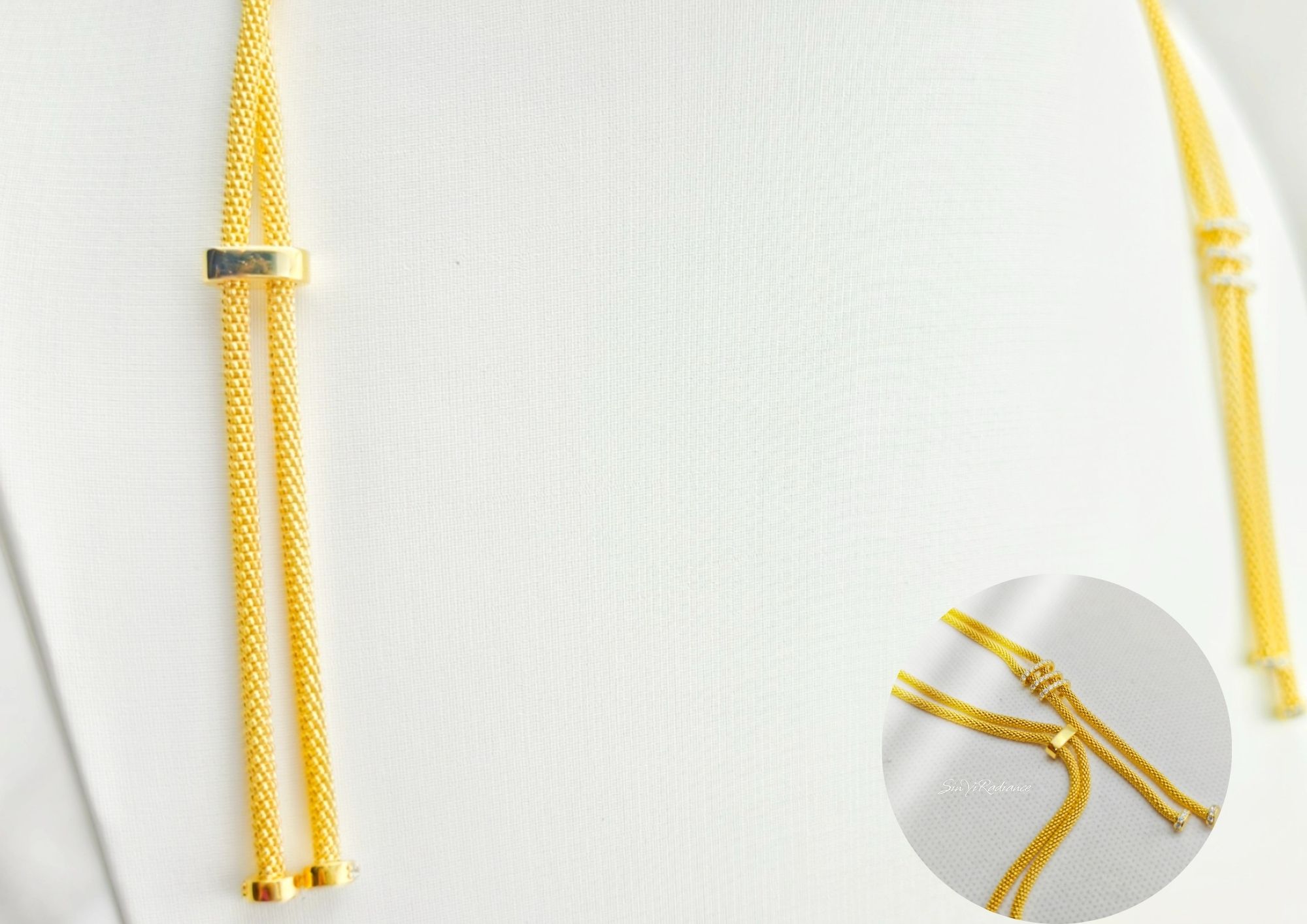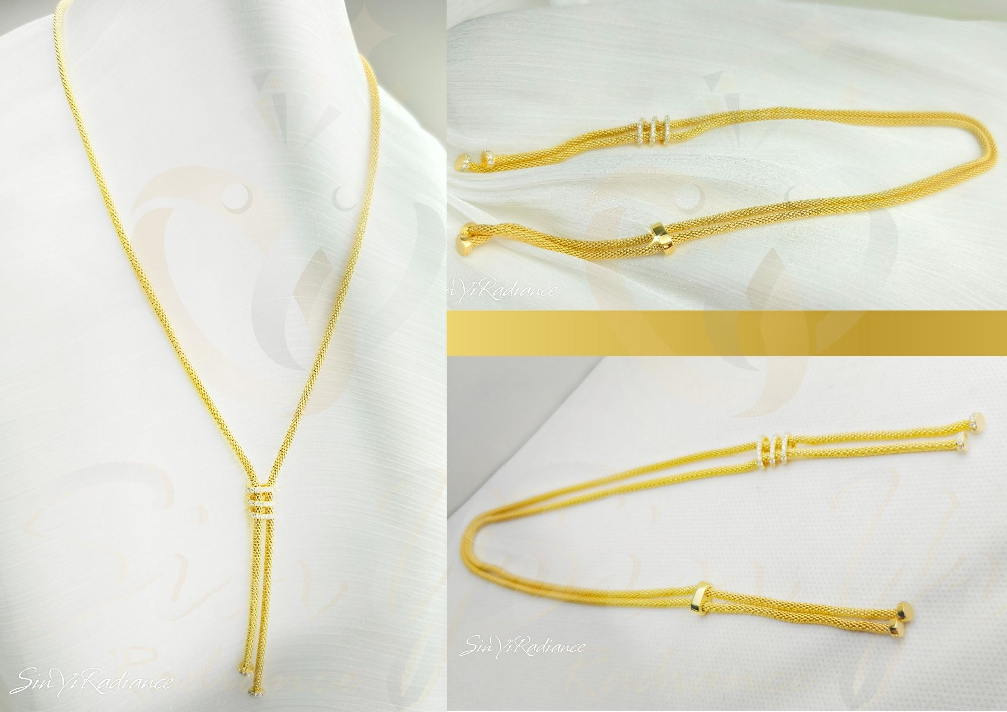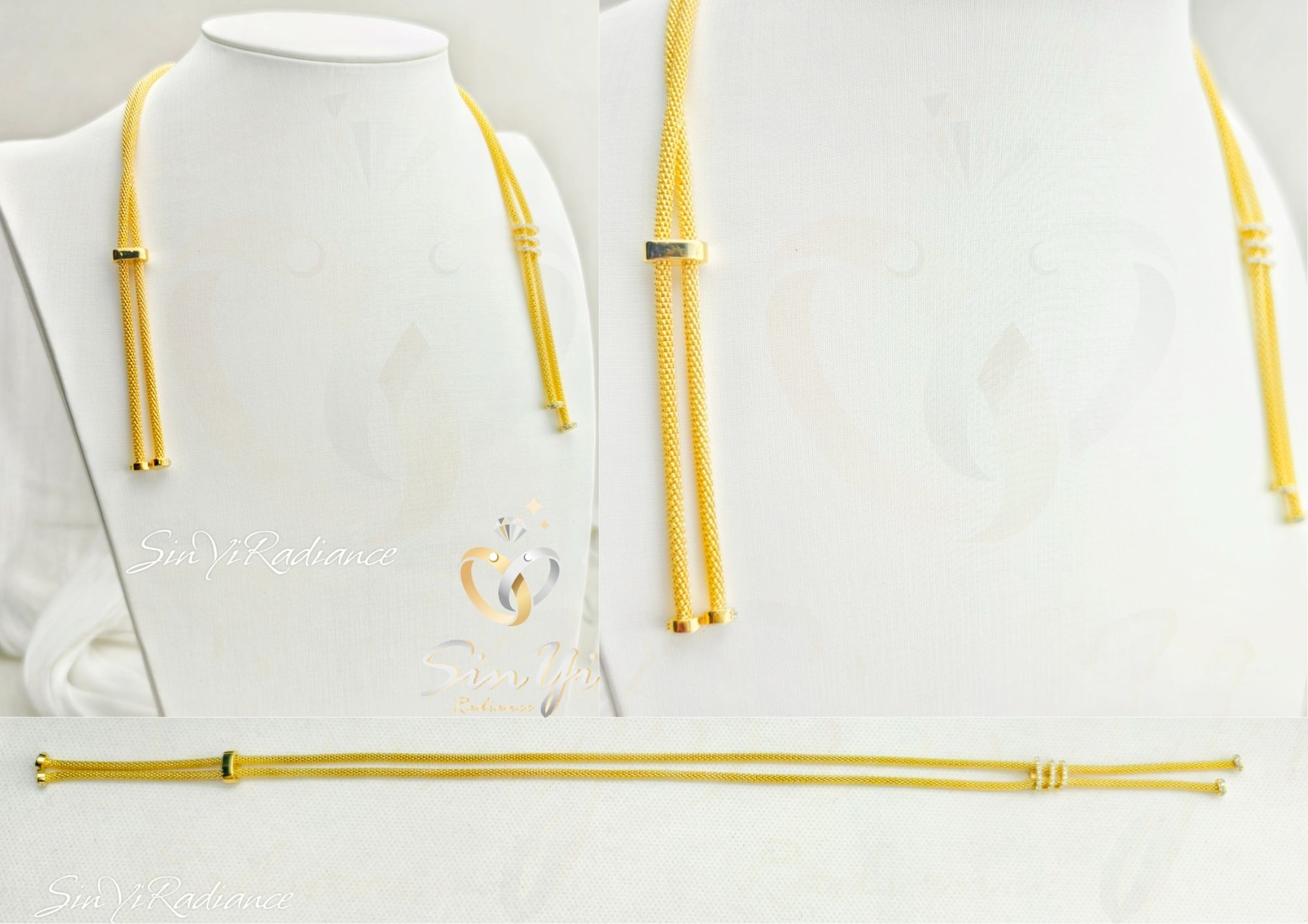 靈感取自「光的垂落」, 以細緻的金色繩鍊交織出柔滑質感, 中央三環閃耀的層疊設計,象徵生命中交錯的光與希望。