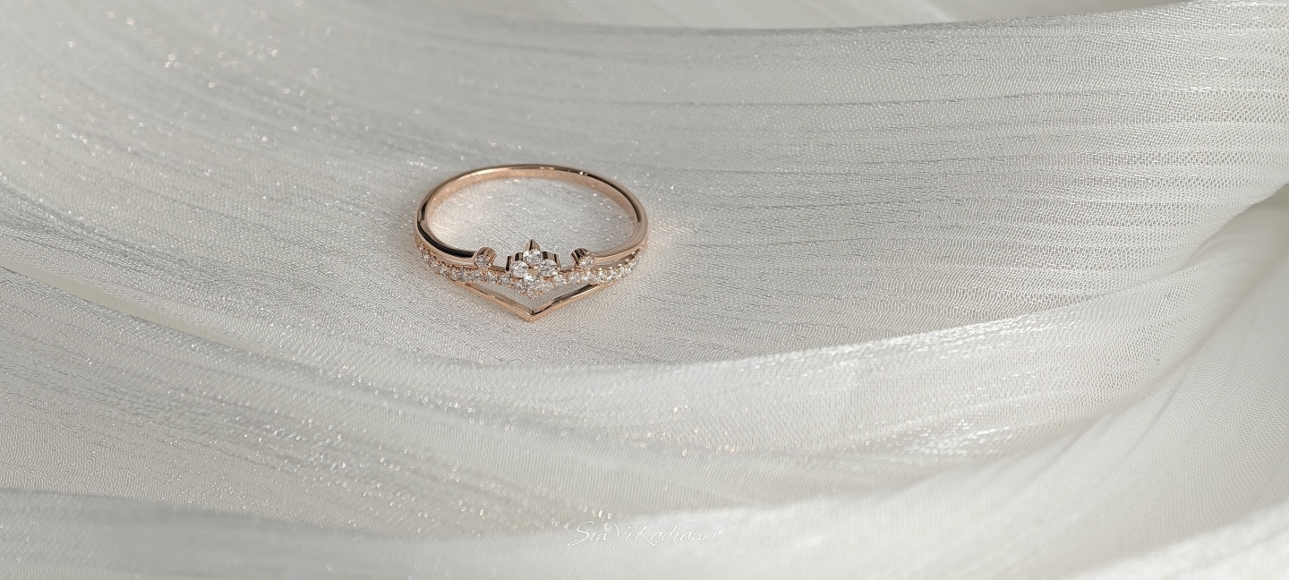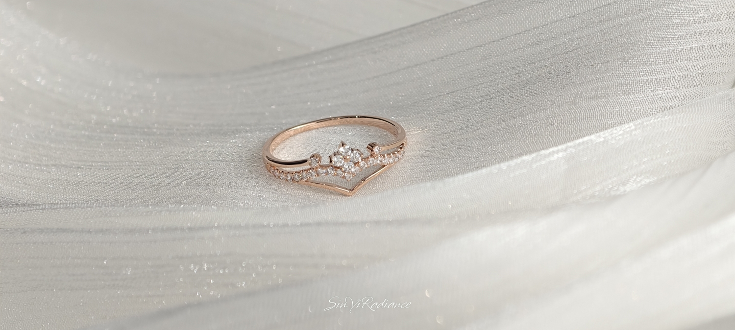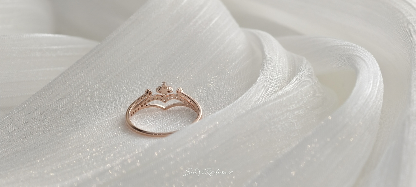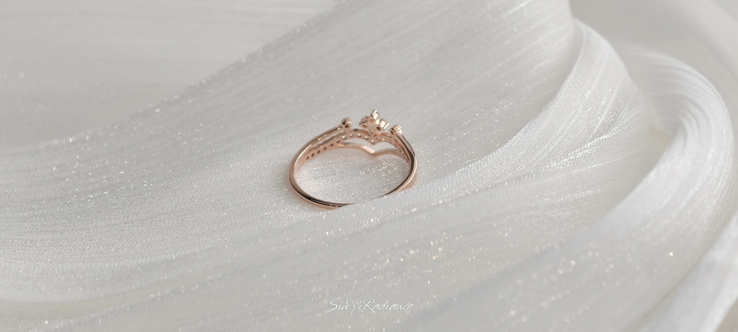 以柔霧玫瑰金打造的 花冠式戒身,點綴一圈細緻鋯鑽,如光芒落在晨霧上的小水滴。 戒面以 優雅V弧線 勾勒手指線條,無論單戴或疊戴,都能呈現輕奢少女感。