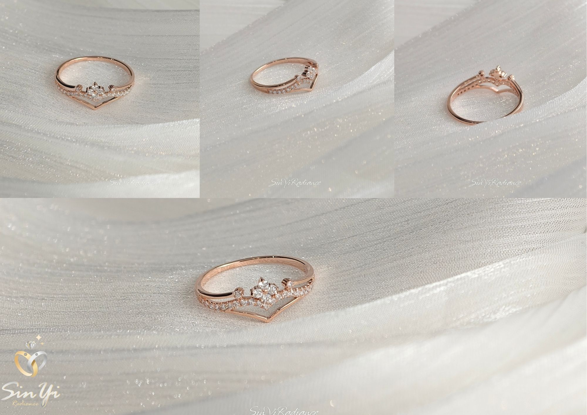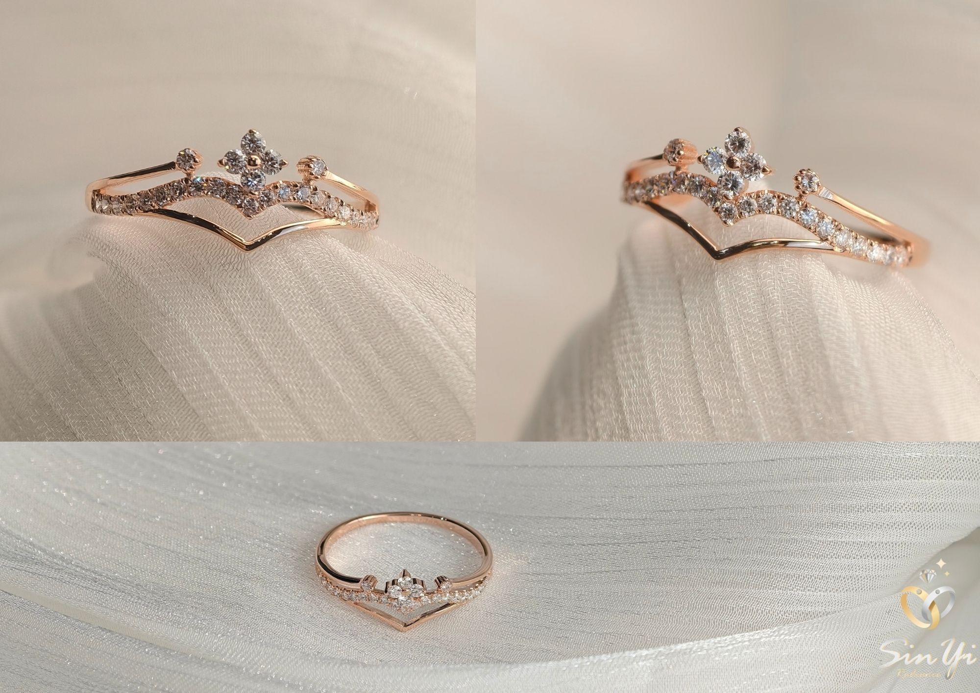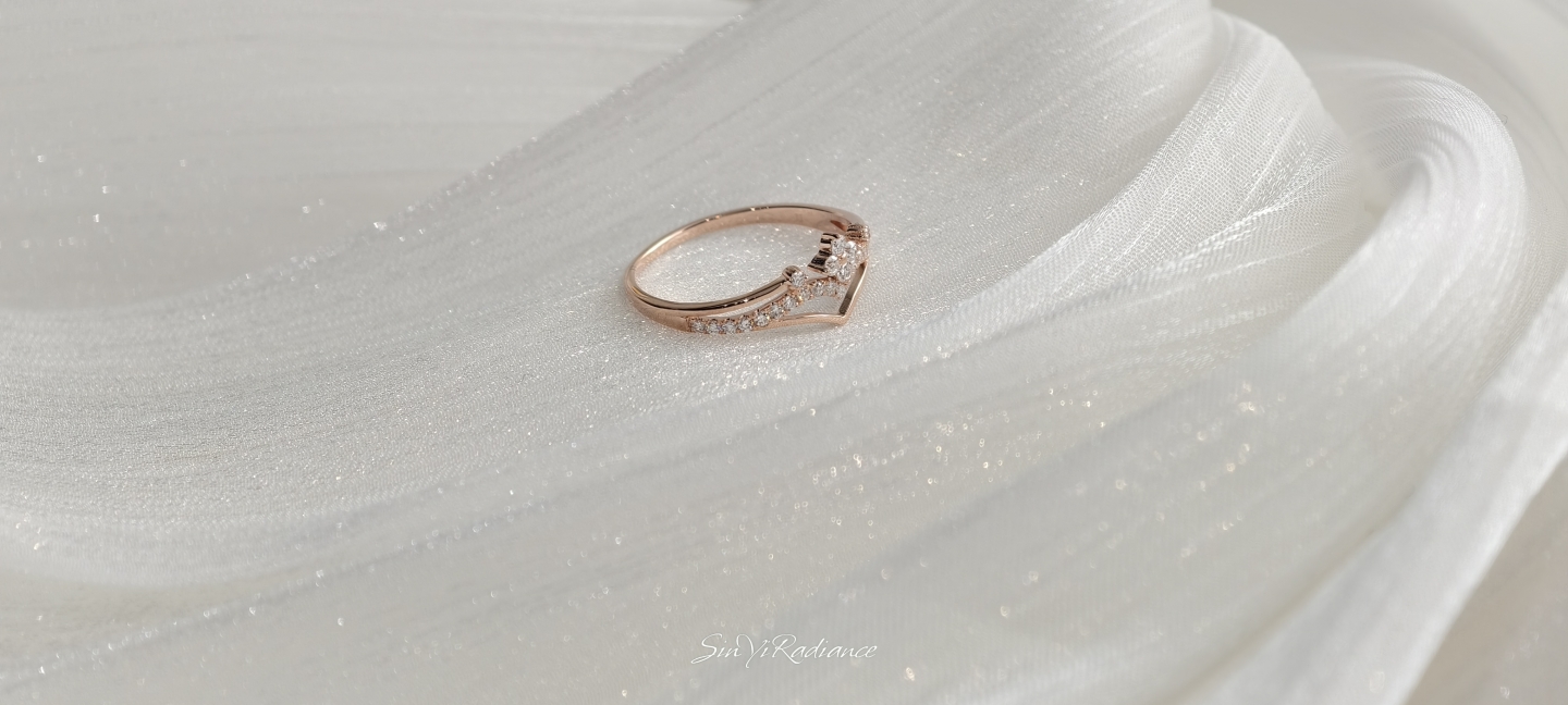 以柔霧玫瑰金打造的 花冠式戒身,點綴一圈細緻鋯鑽,如光芒落在晨霧上的小水滴。 戒面以 優雅V弧線 勾勒手指線條,無論單戴或疊戴,都能呈現輕奢少女感。