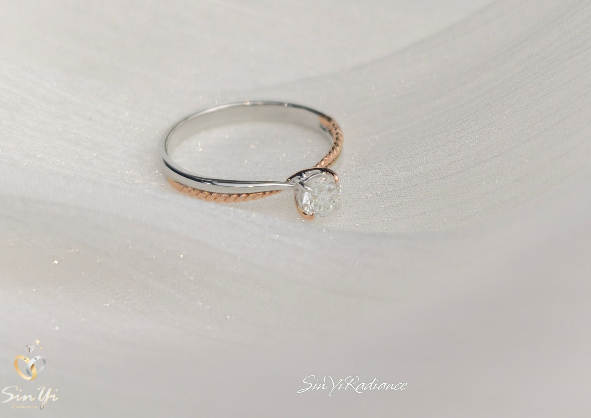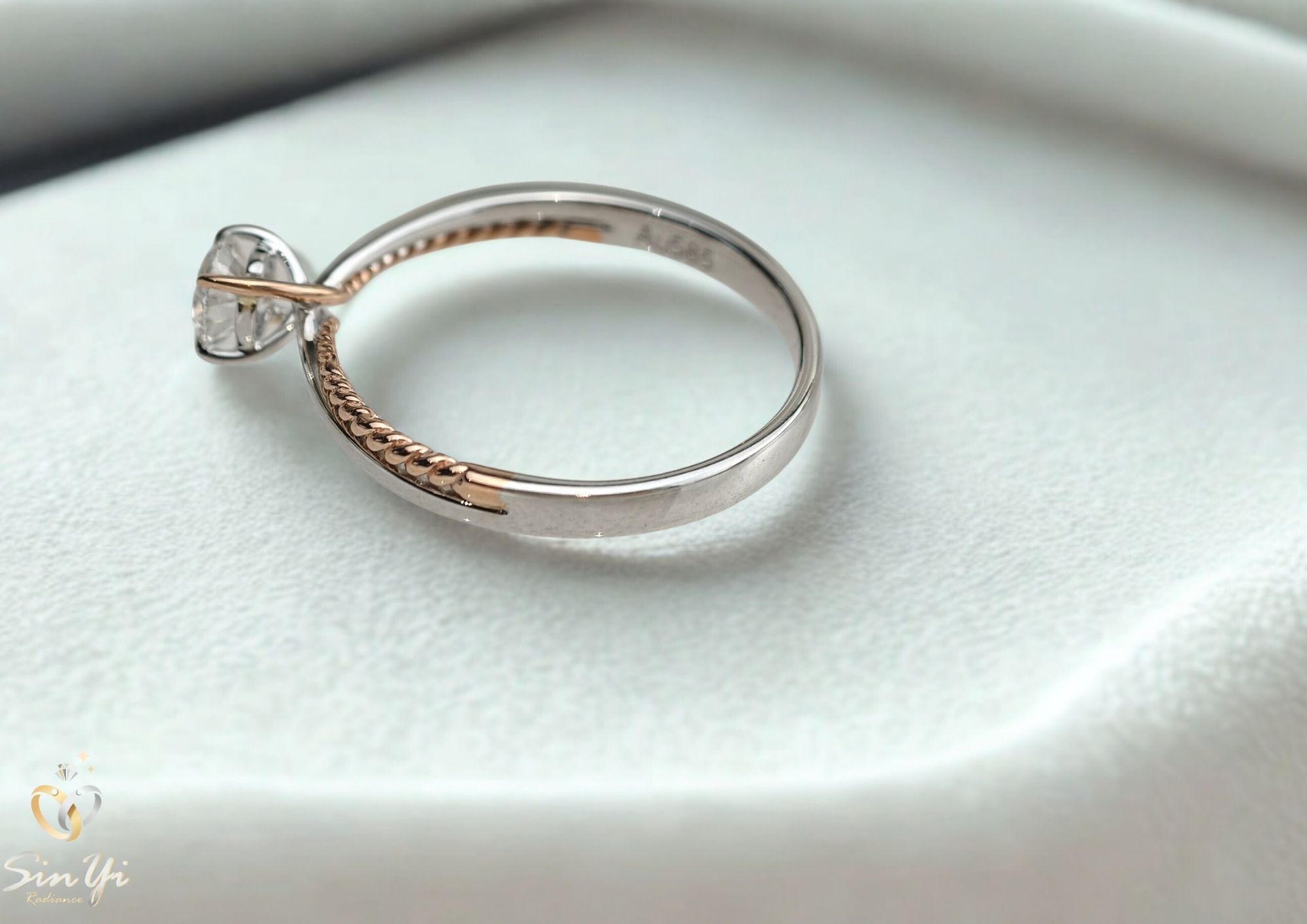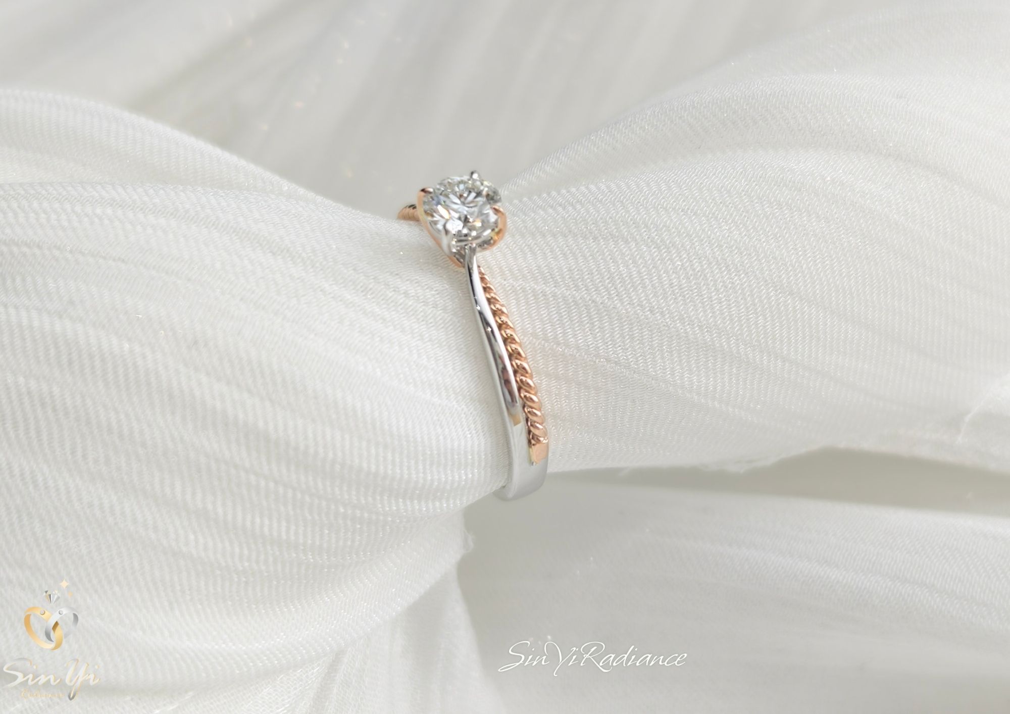 戒臂後半圈以 玫瑰金扭繩線條打造,