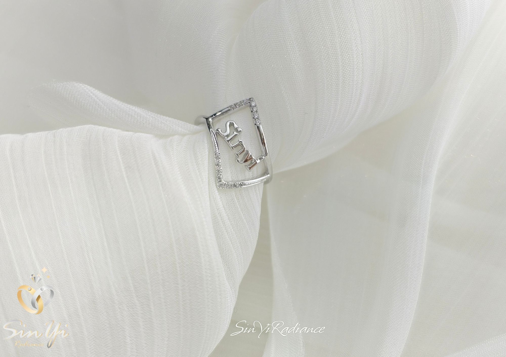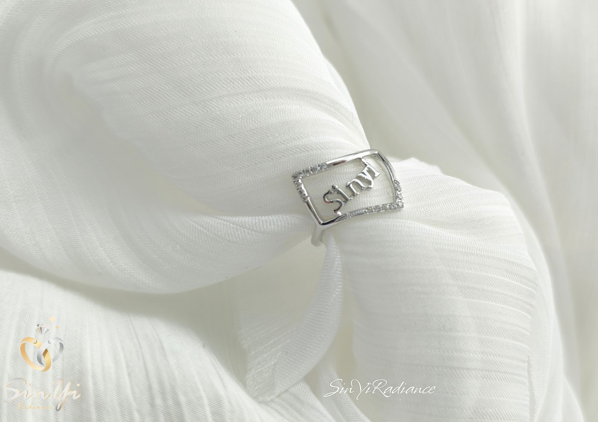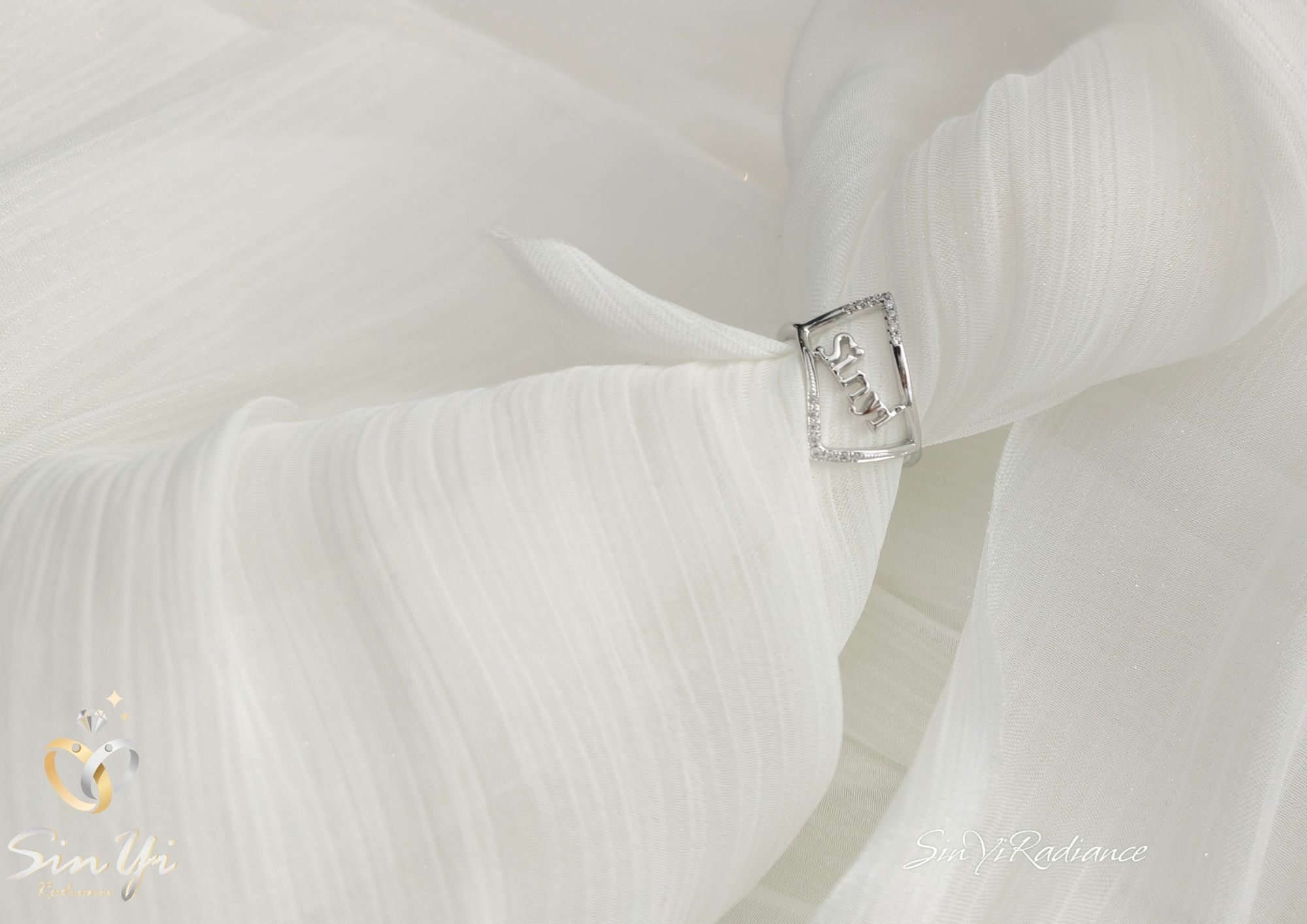 以俐落幾何線條勾勒專屬名字,將字母化為設計主體, 象徵獨一無二的自我標誌。 戒身採開放式框架造型,搭配細緻鑲鑽點綴, 讓光線在指間流動,呈現低調卻不失亮點的現代感。