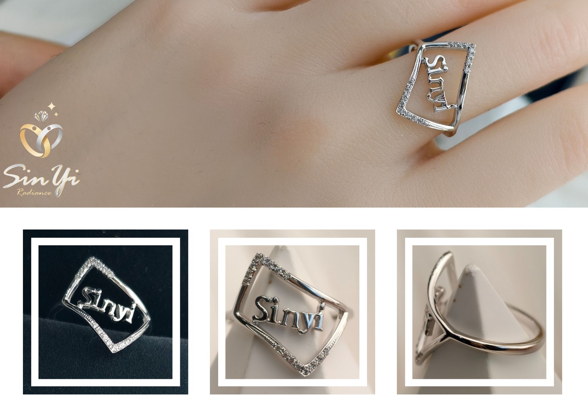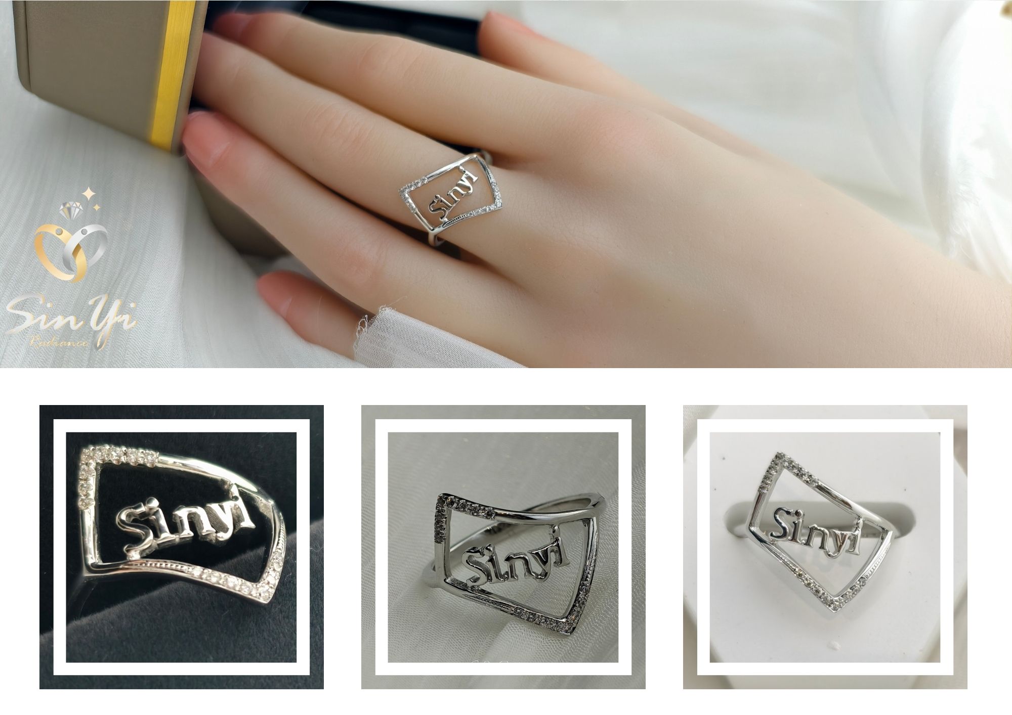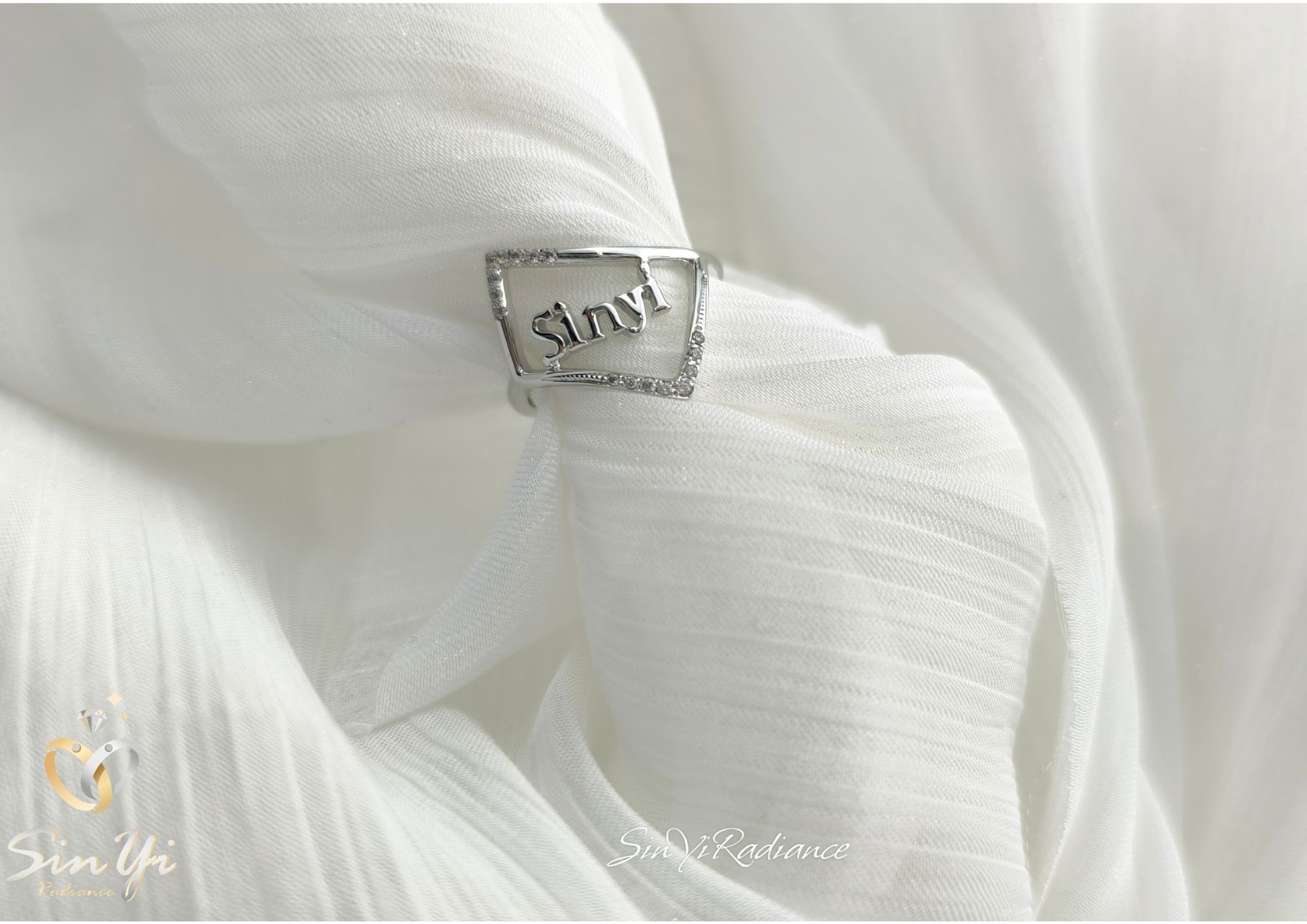 以俐落幾何線條勾勒專屬名字,將字母化為設計主體, 象徵獨一無二的自我標誌。 戒身採開放式框架造型,搭配細緻鑲鑽點綴, 讓光線在指間流動,呈現低調卻不失亮點的現代感。