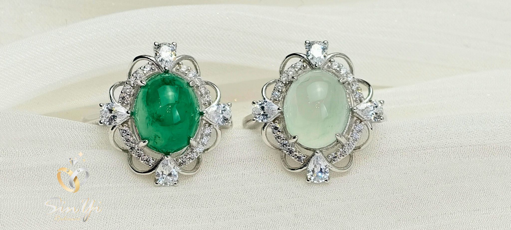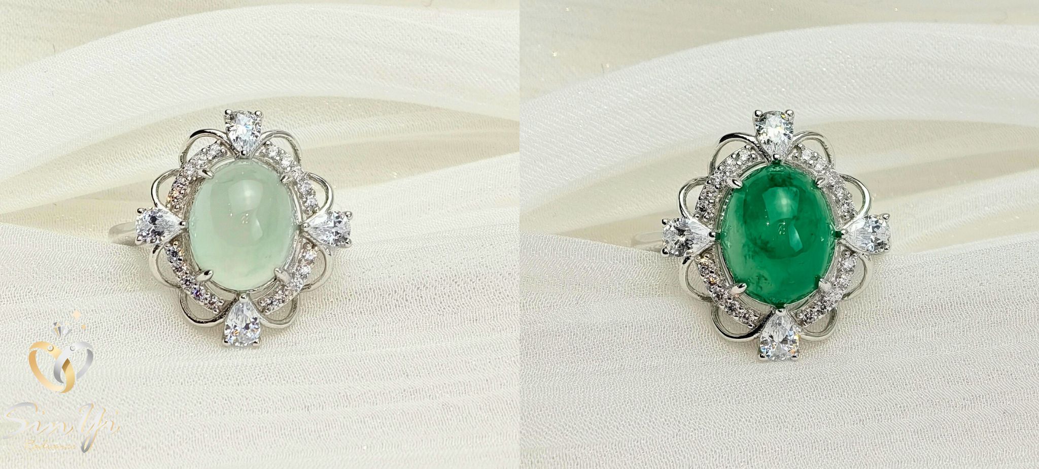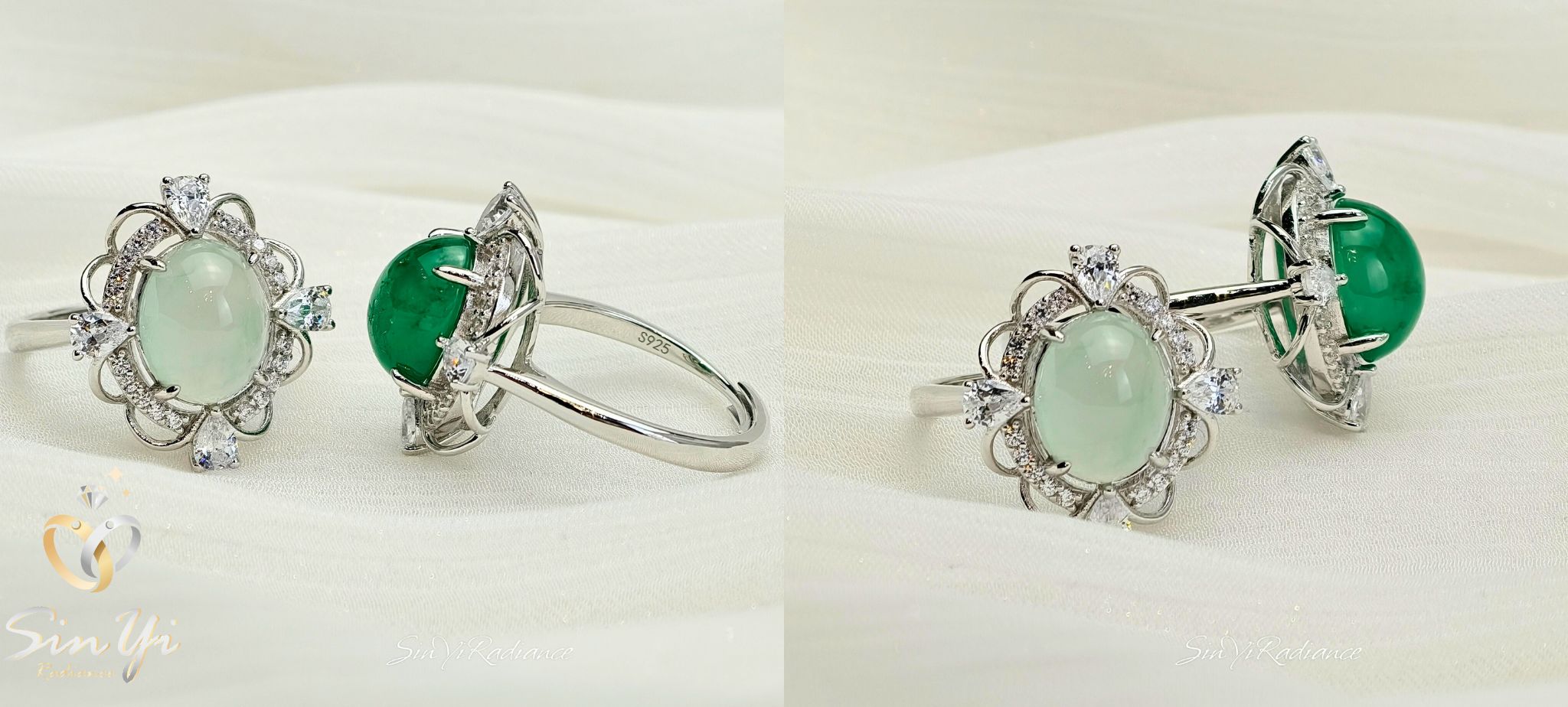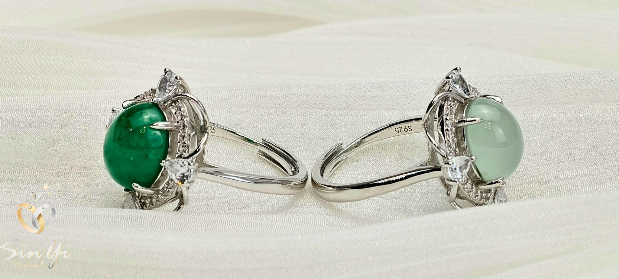 如同被細緻鑽光環繞的綠色花冠, 溫潤深邃的綠色,在光線下靜靜流動。 環鑽包圍,細節精緻有層次