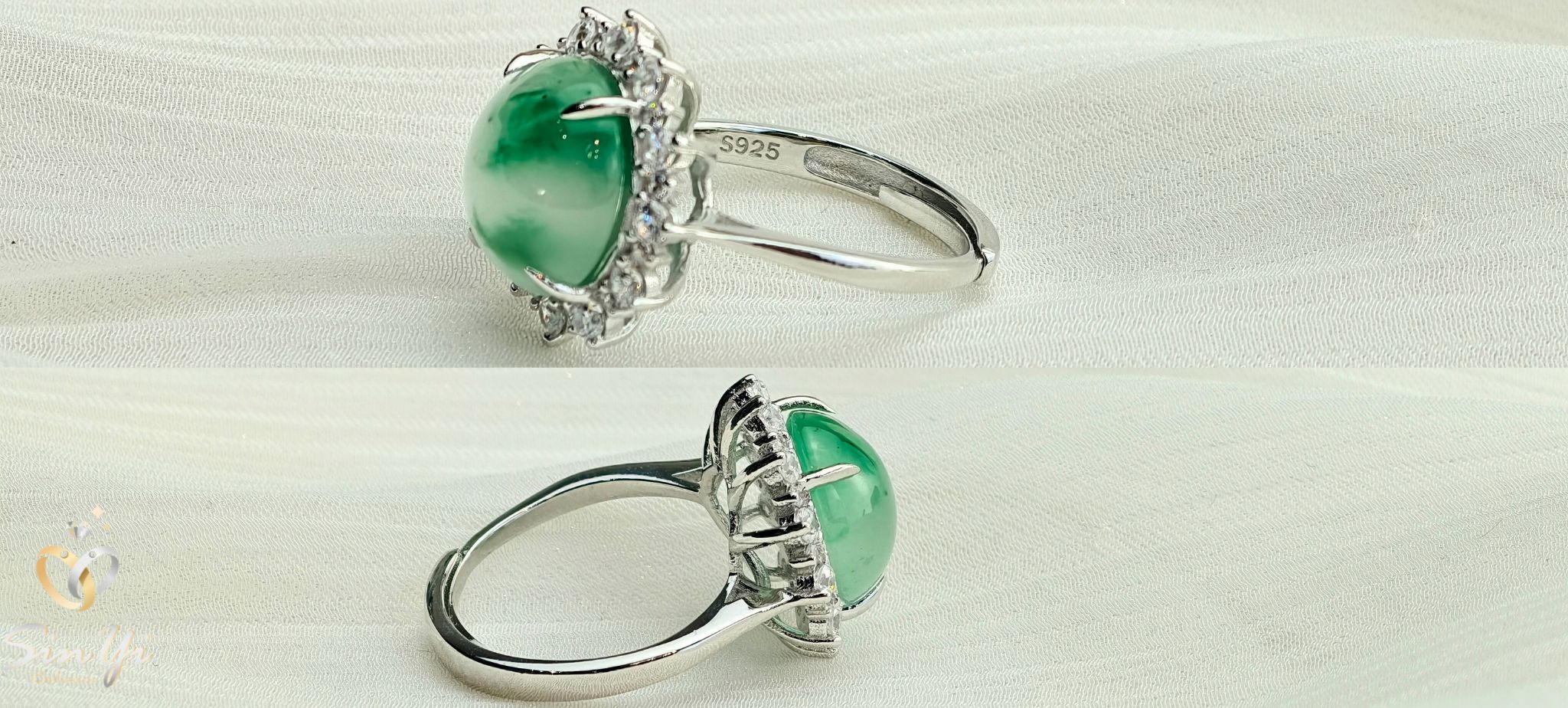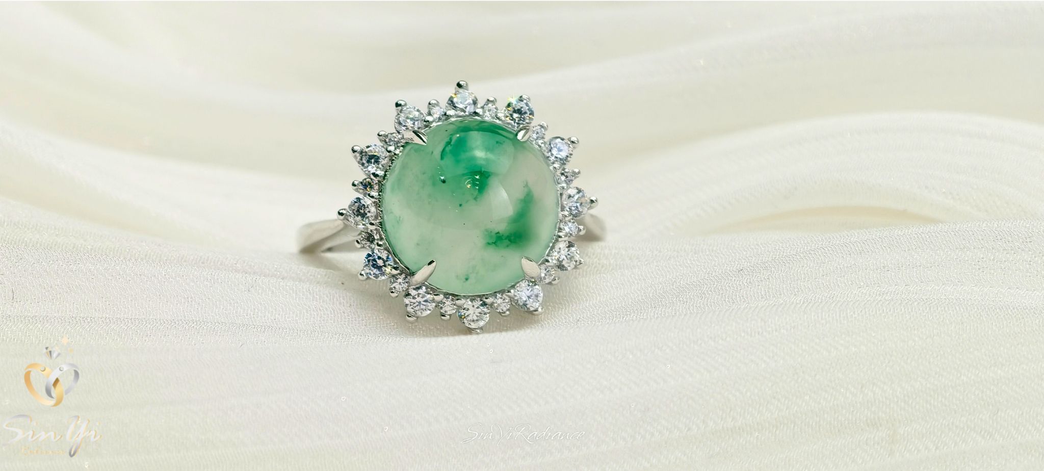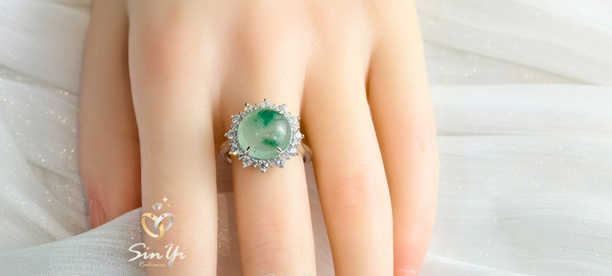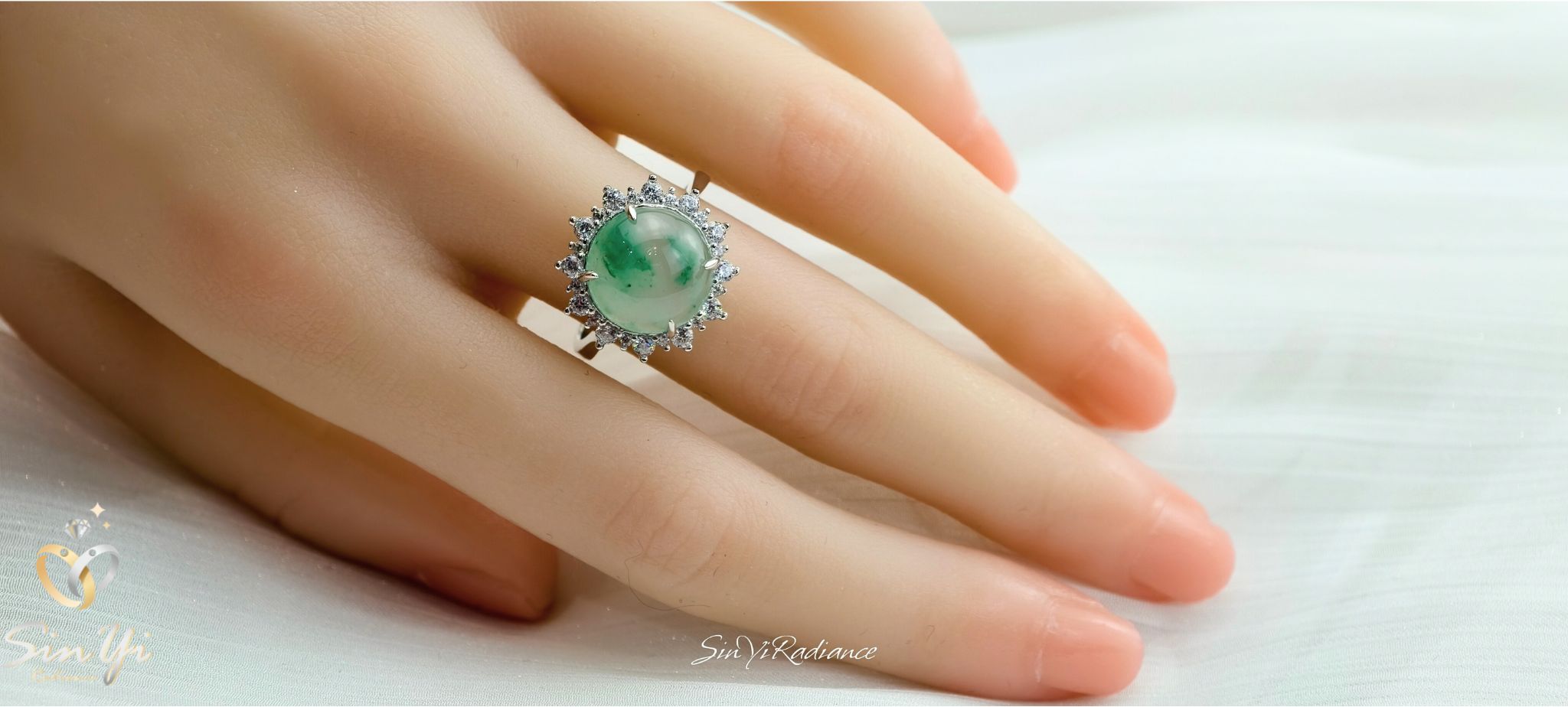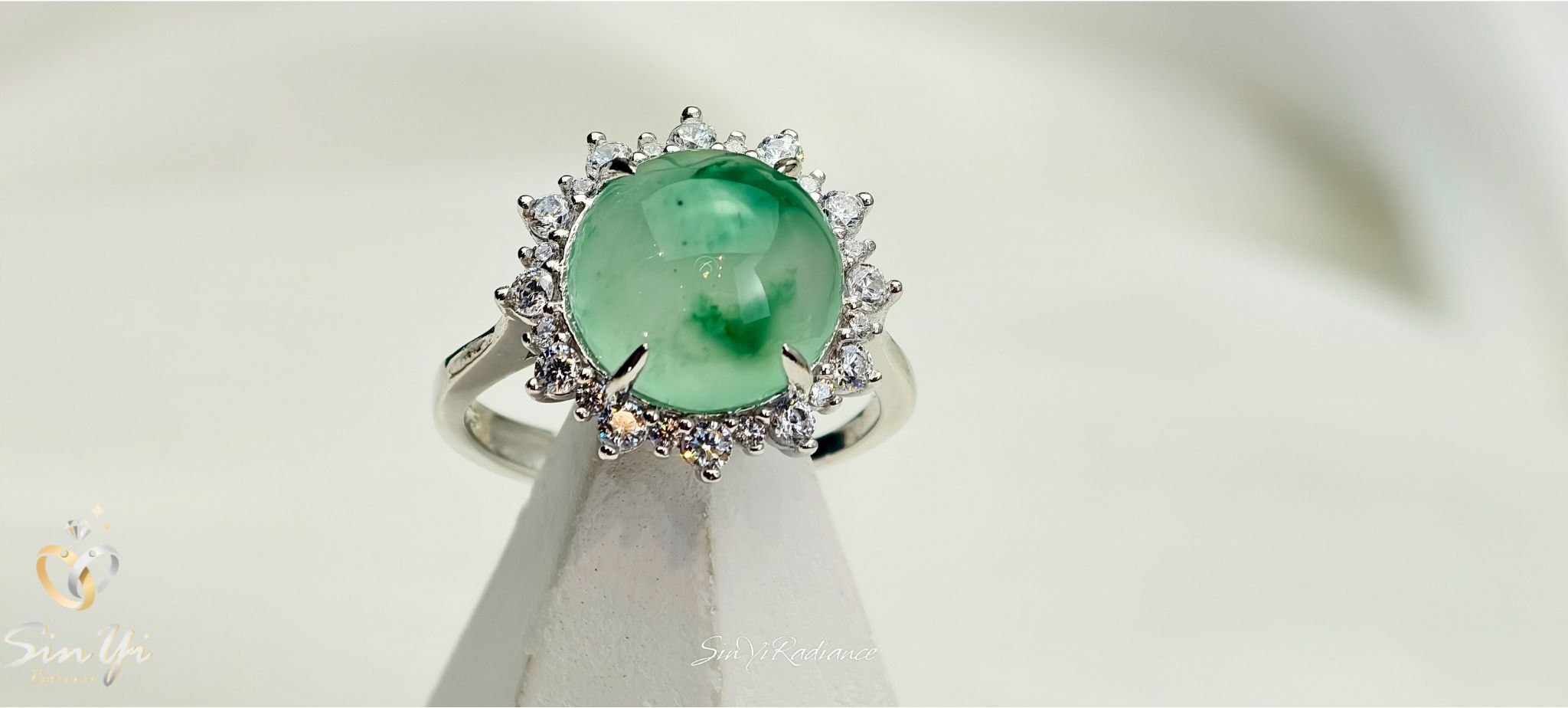 一抹溫潤的綠,靜靜落在指間, 如霧中山嵐,清透卻深遠。 以細緻鑽光環繞, 為柔和的玉色添上一圈光的層次, 在低調之中,展現從容與優雅。