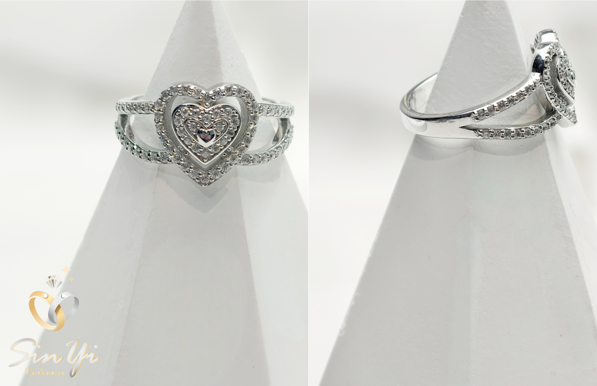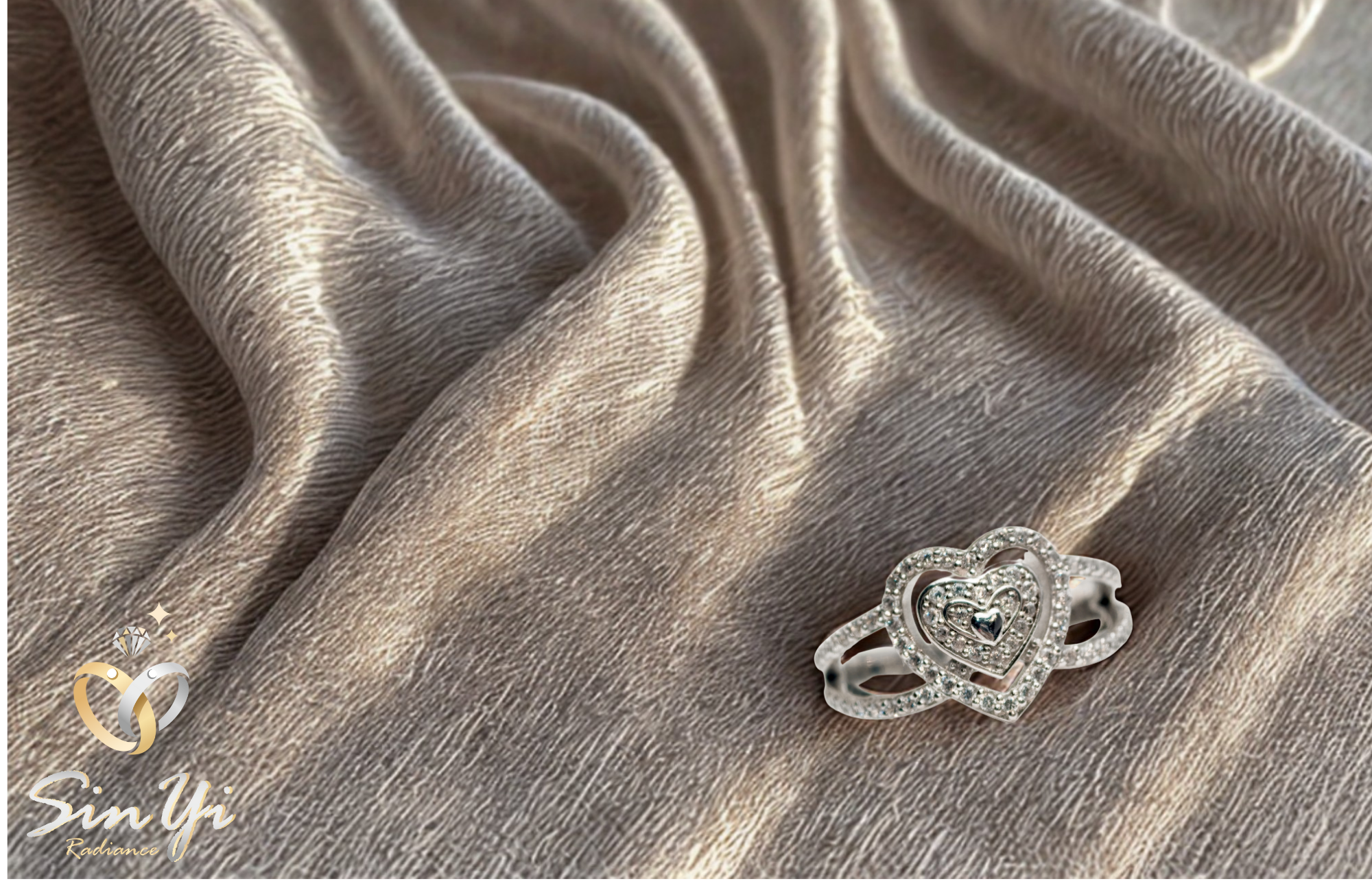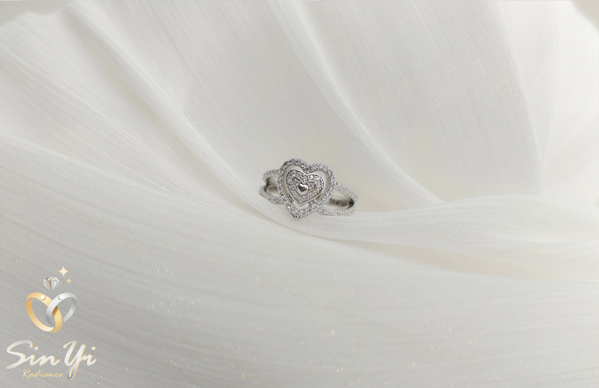 以雙層愛心為靈感,將愛意層層疊映於指尖,象徵心心相印、深情相依。 璀璨鋯鑽環繞中央主石,如同愛的光芒,閃耀著專屬兩人的甜蜜記號。