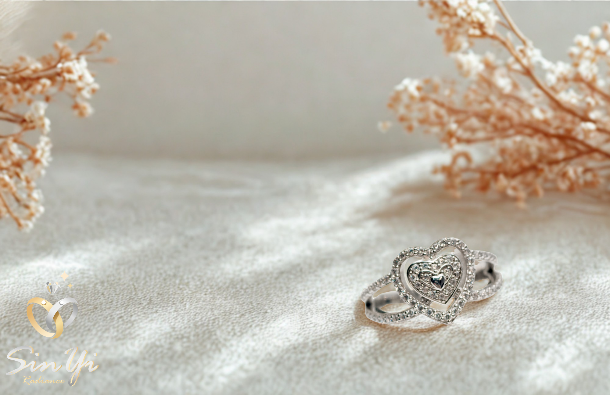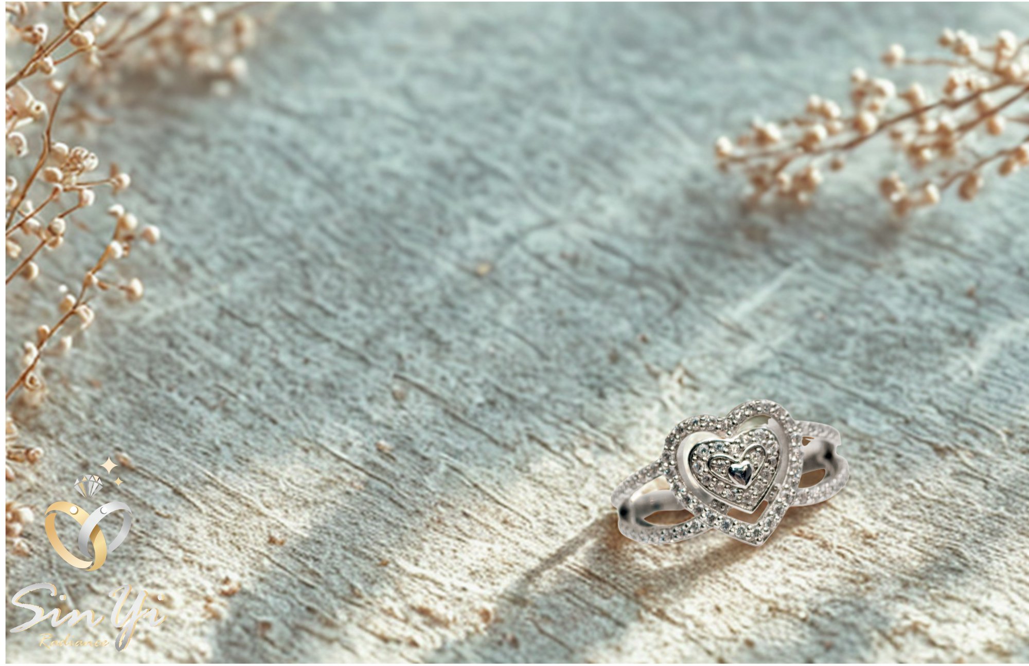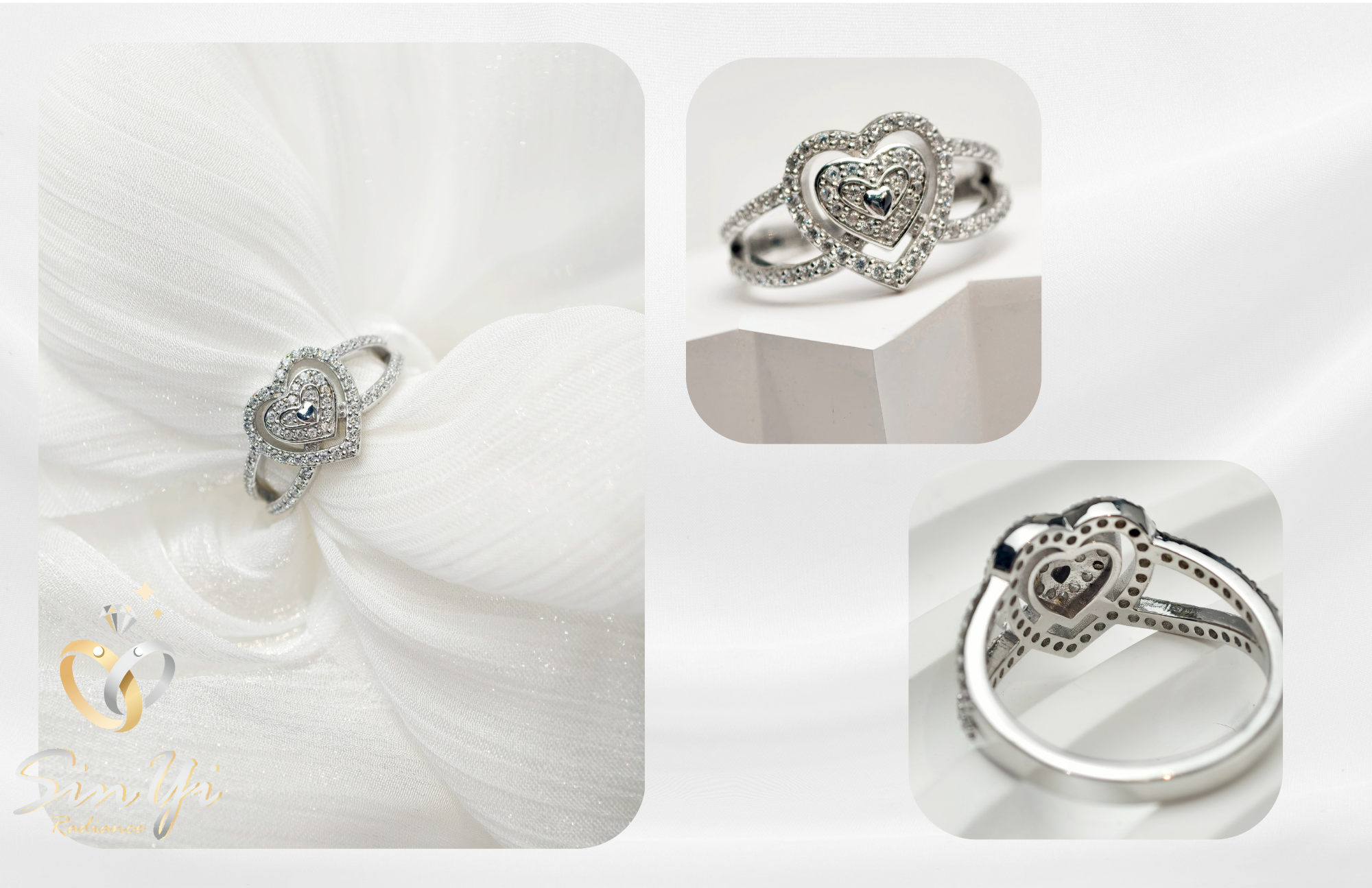 以雙層愛心為靈感,將愛意層層疊映於指尖,象徵心心相印、深情相依。 璀璨鋯鑽環繞中央主石,如同愛的光芒,閃耀著專屬兩人的甜蜜記號。