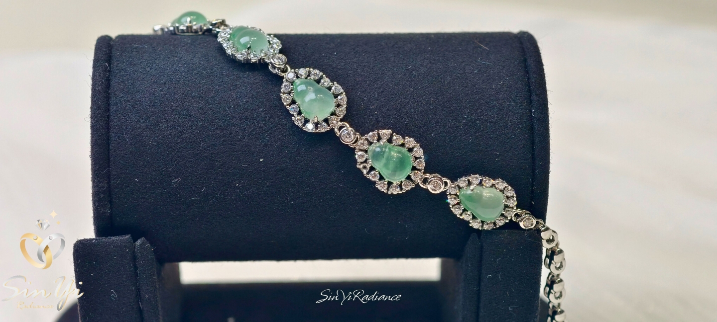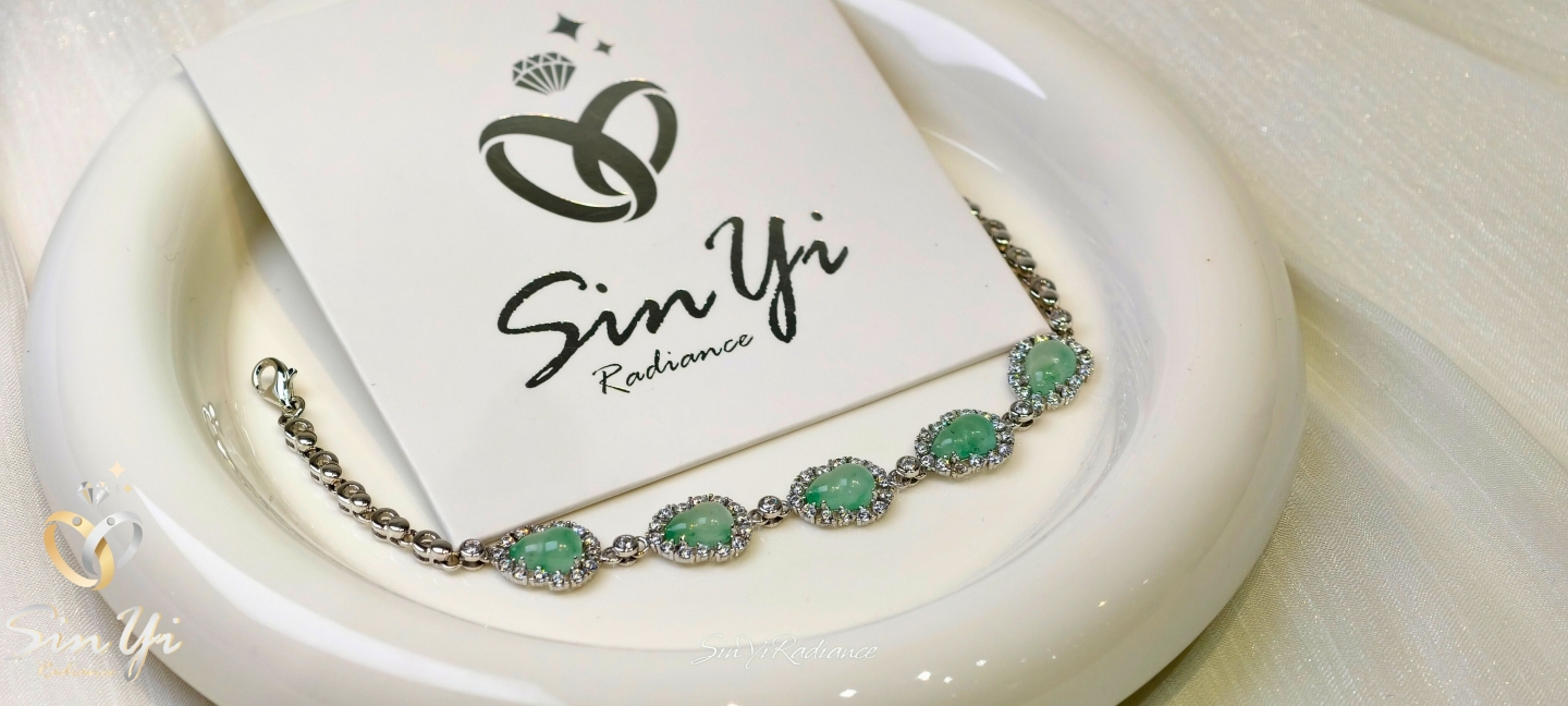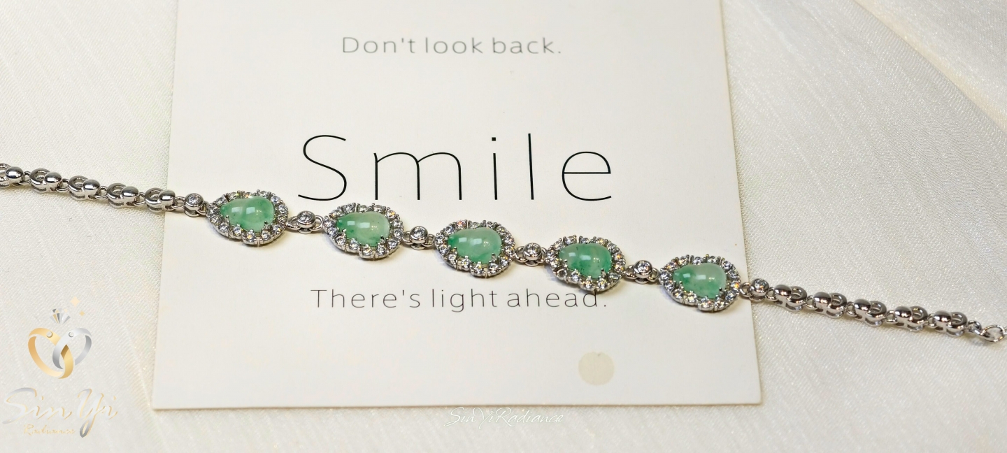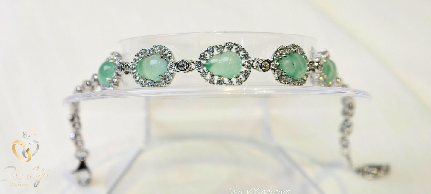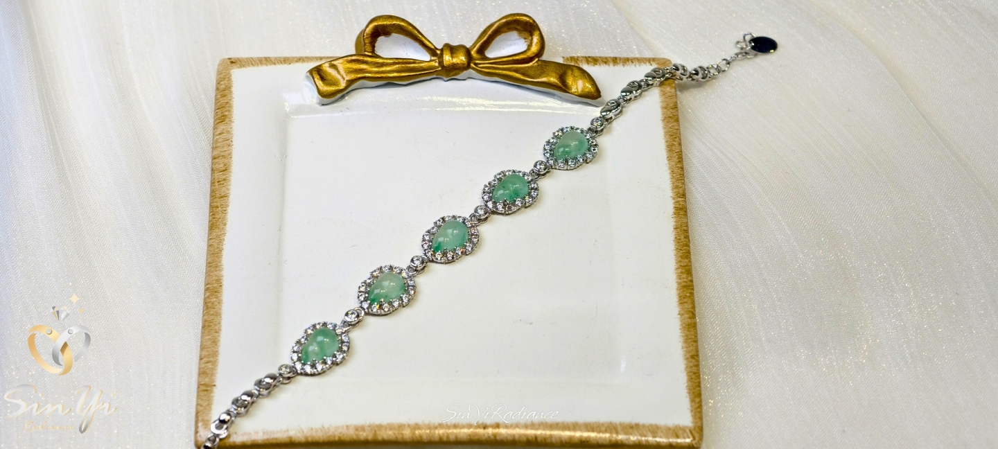光,沿著手腕緩緩流動。 水滴形綠玉,層層相連, 鋯石細緻圍鑲,映出溫潤而不張揚的光芒。